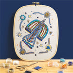 El set incluye: 1 tambor de bordado en madera, 1 tela impresa con el diseño,1 par de tijeras de bordado, 9 cajas de perlas y lentejuelas, 1 tapete de enfilado, 2 agujas, 1 enhebrador / pasa-hilos, 2 bobinas de hilo azul, 1 modelo-guía para seguir el diseño