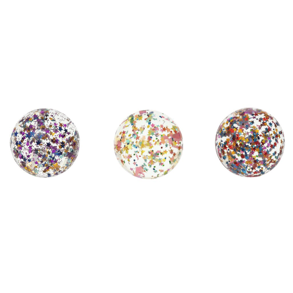 Pelota saltarina de goma coloridas con confeti de estrellas o puntos.