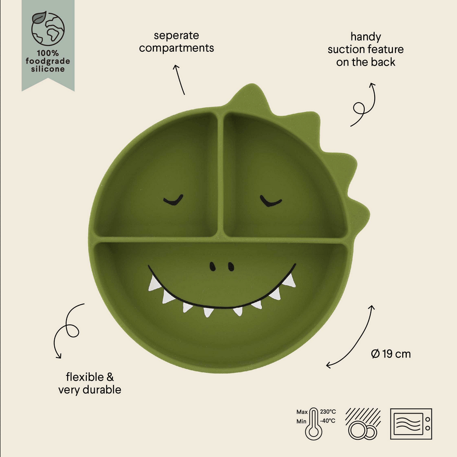 La hora de la comida será más divertida que nunca con la compañía del amigo animal favorito de tu pequeño. No se trata sólo de una simpática carita, sino también ofrece una práctica ventosa que permite que el plato se adhiera a cualquier superficie lisa, evitando que se caiga. Además, este plato se compone de varios compartimentos para ayudar a los niños a diferenciar alimentos, sabores y texturas. Fabricado en silicona 100%, es suave al tacto, no se rompe al caer y es apto para microondas, horno, congelador y lavavajillas.