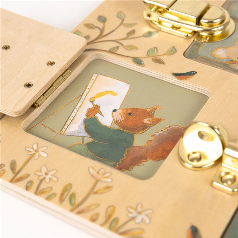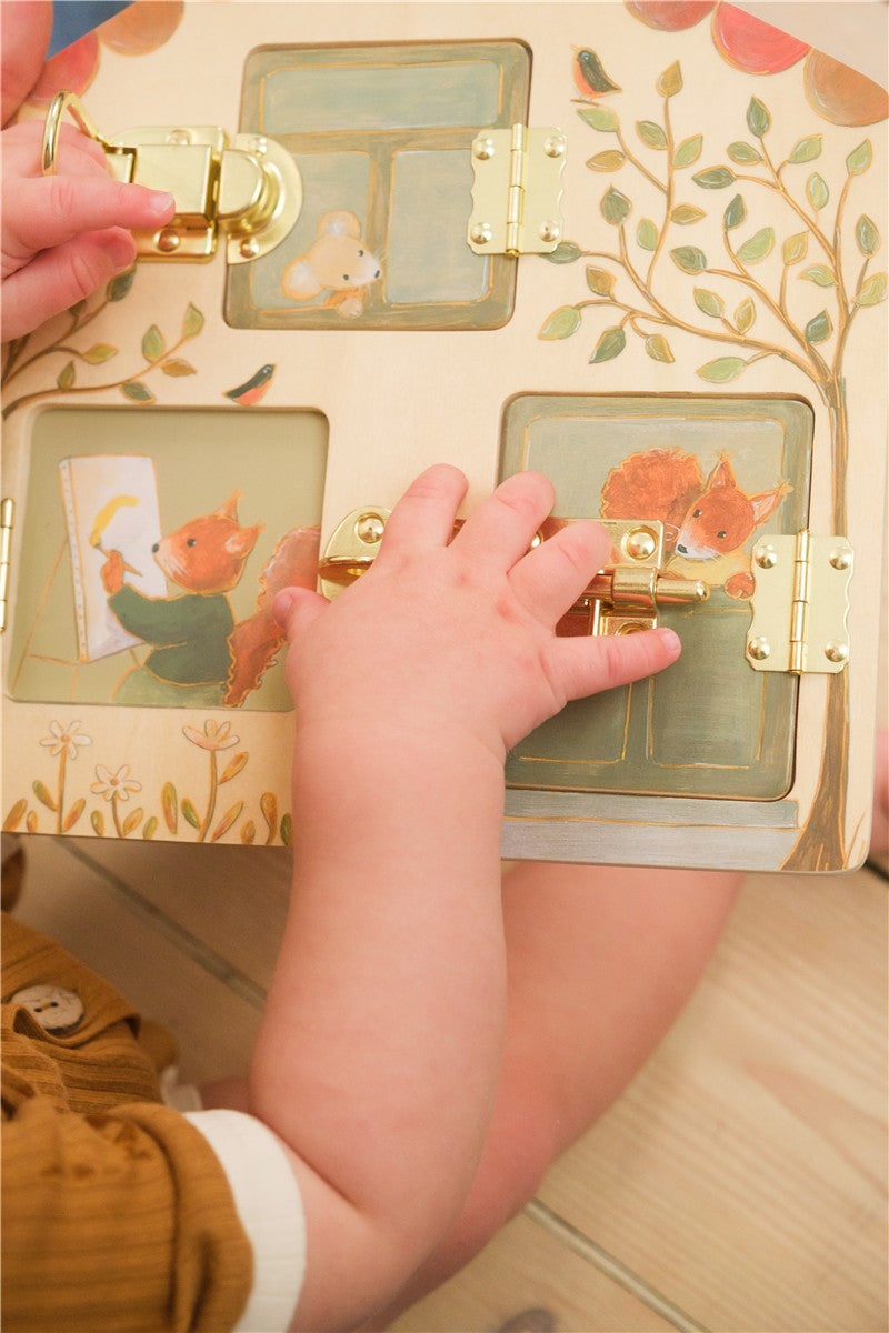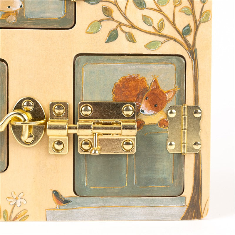 Tablero de cierres para experimentar y practicar abertura de cerraduras, ideal para la motricidad fina.