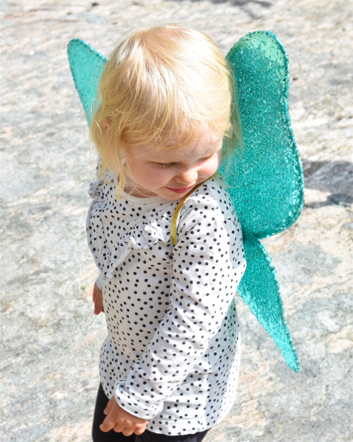 Alas con lentejuelas de color turquesa y con un detalle de estrella con purpurina dorada.