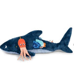 Bellamente confeccionado en tela súper suave que deja una sensación muy agradable al tacto, el tiburón tiene un espejito en el lomo, dos agallas de papel-cruje y tres sonajeros: uno en la estrella de mar que se esconde en su escondrijo, otro en el pez volador que lleva a su lado y el último en el pulpo que le acompaña.
