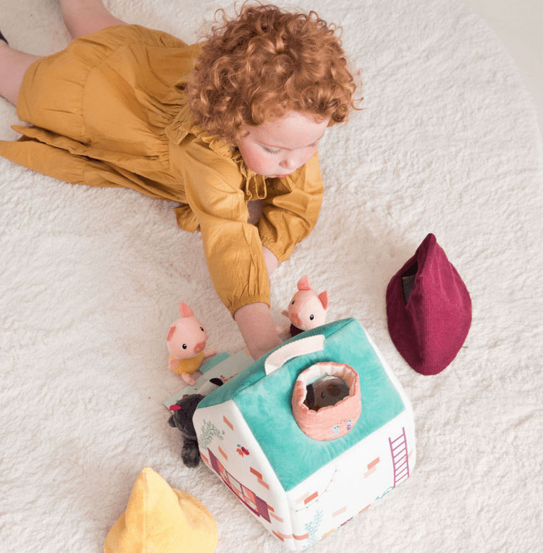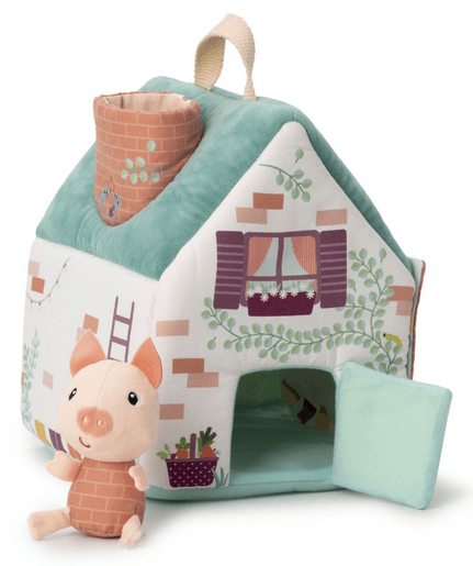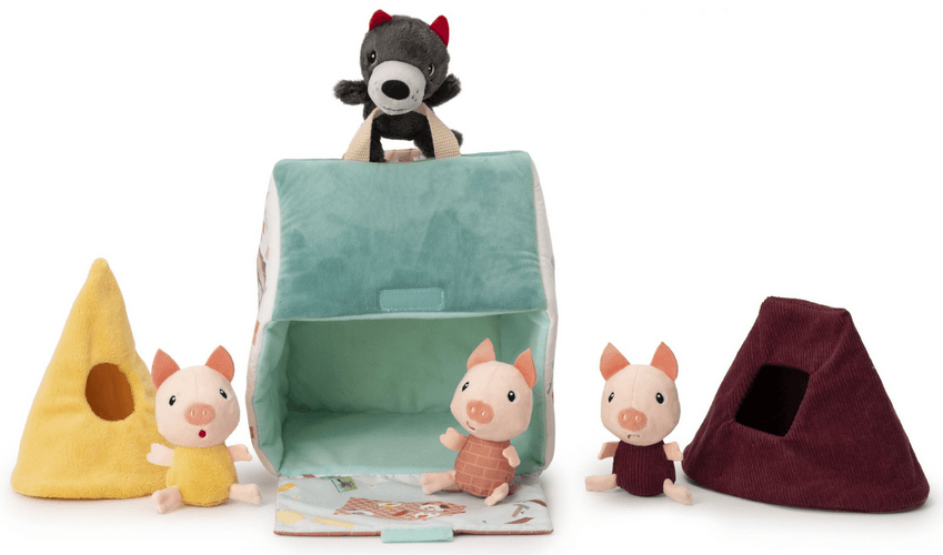 Este juguete de tela, inspirado en el cuento del lobo y los tres cerditos, incluye 4 personajes, 2 casitas que representan las casas de paja y madera, y una tercera casa que representa la casa de ladrillos. La casa de ladrillos tiene una chimenea por donde el lobo puede deslizarse, así como una pared que se abre. Estimulando la imaginación, este juguete fomenta el juego creativo y desarrolla habilidades motoras finas.