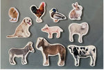 • Animales de la granja, incluye: caballo, gallo, oveja, pollito, conejo, vaca, perro, pato, burro y cerdito.