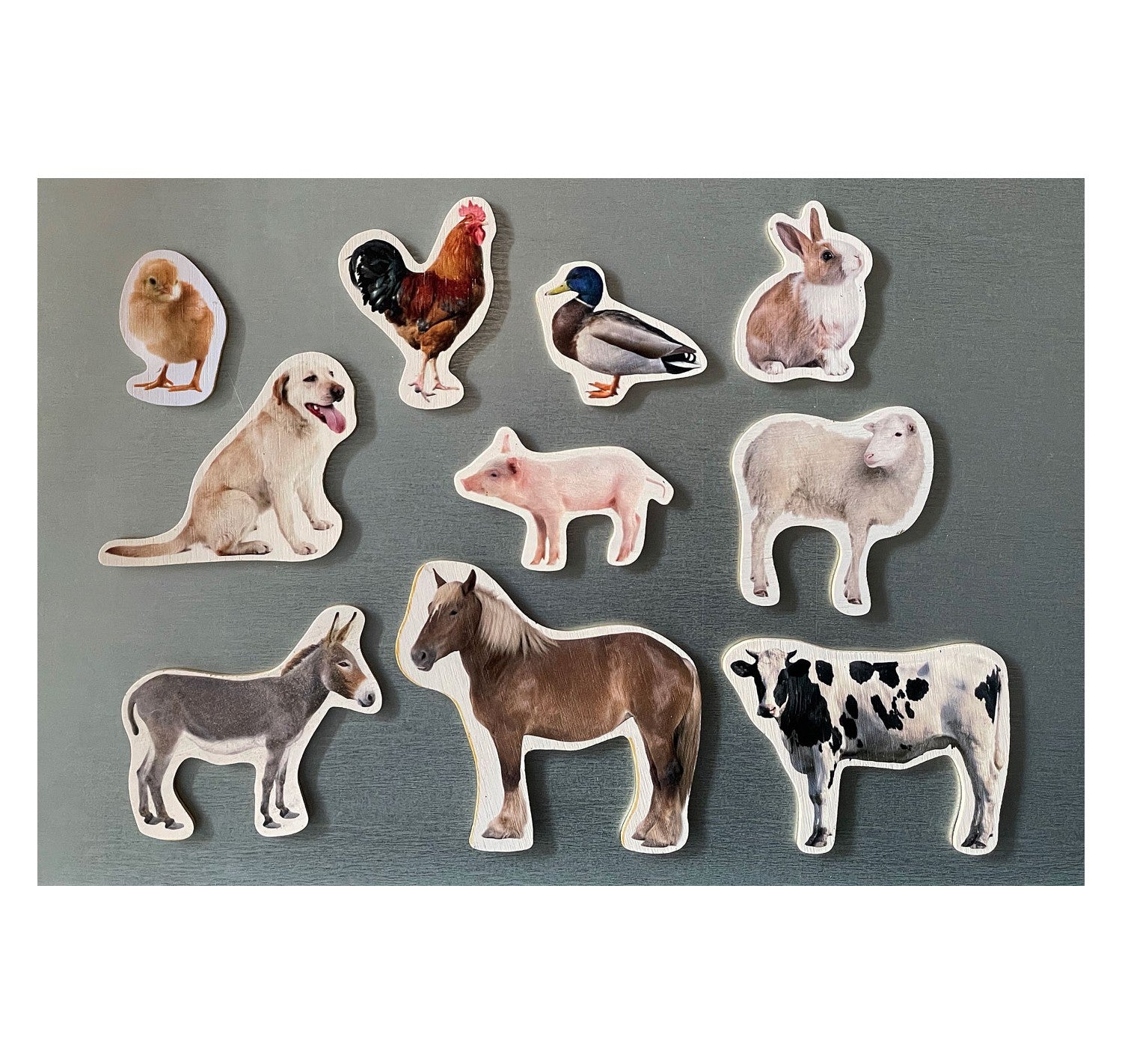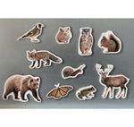 Diez imanes en madera de bambú con imágenes reales de animales impresas directamente sobre la superficie de bambú.