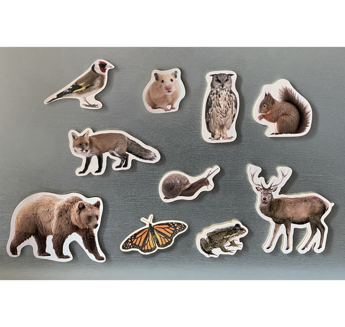 • Animales del bosque, incluye: ciervo, caracol, oso, pájaro, ardilla, rana, ratón, búho, zorro y mariposa.