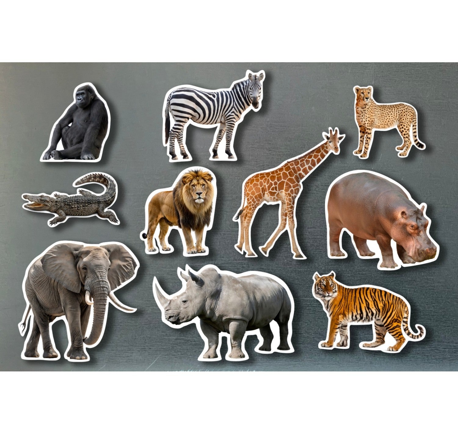 • Animales salvajes, incluye: rinoceronte, león, guepardo, hipopótamo, elefante, jirafa, cebra, gorila, cocodrilo y tigre.