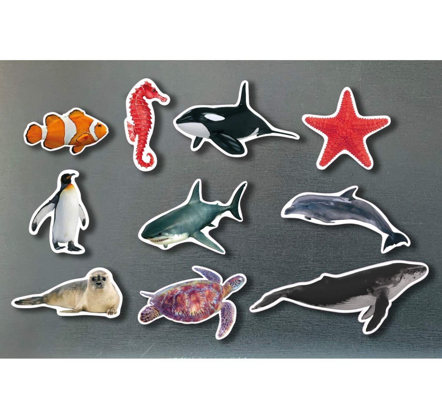 • Animales marinos, incluye: delfín, ballena, foca, estrella de mar, pez, caballito de mar, pingüino, tortuga, orca y tiburón.
