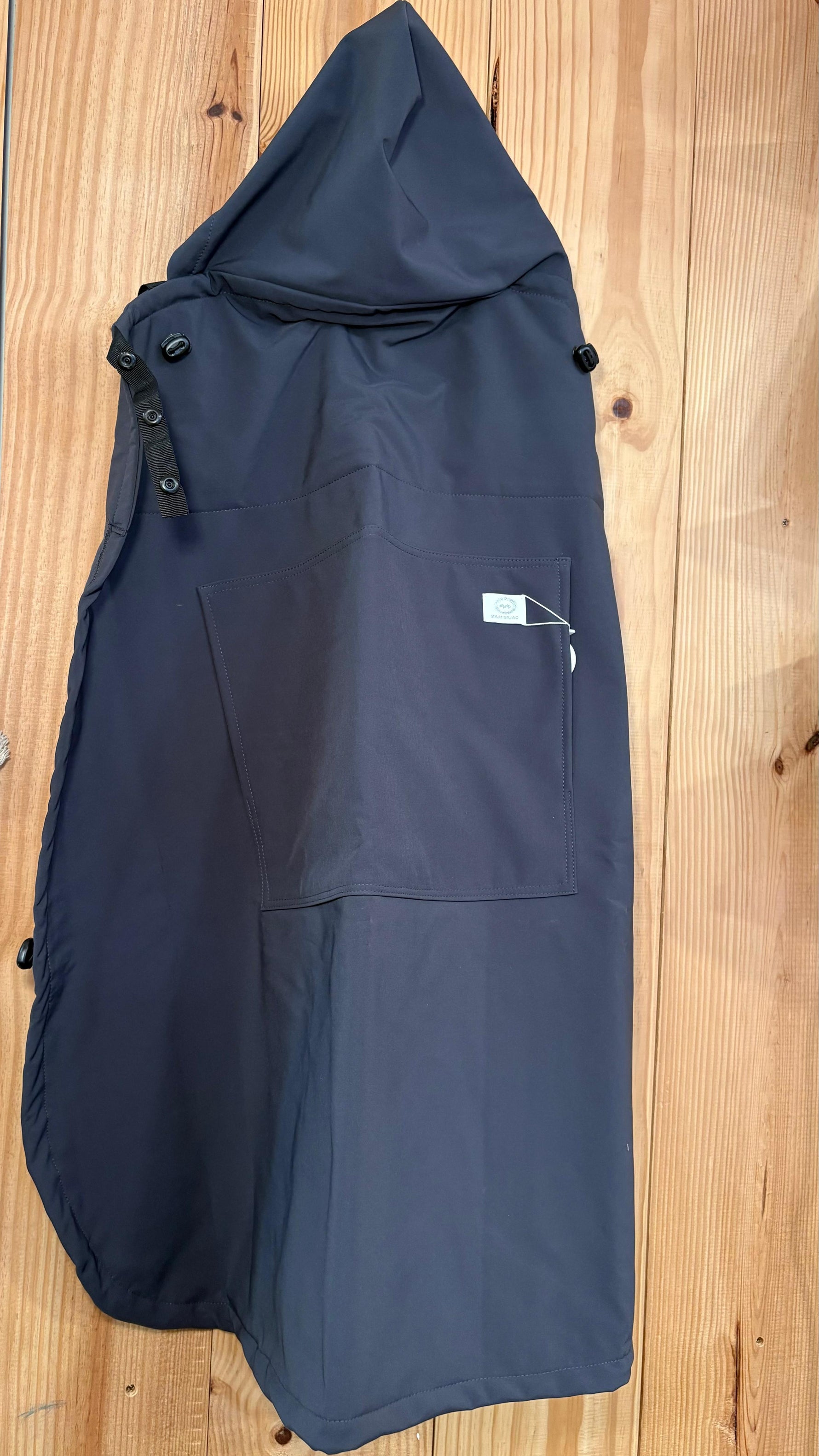 Cobertor de porteo impermeable con forro polar universal. Con capucha para cubrir la cabecita del bebé y bolsillo para proteger las manos del porteador.