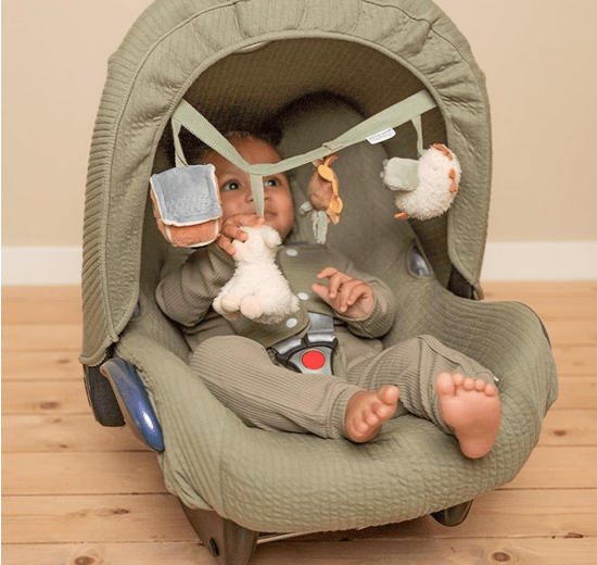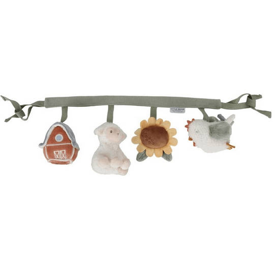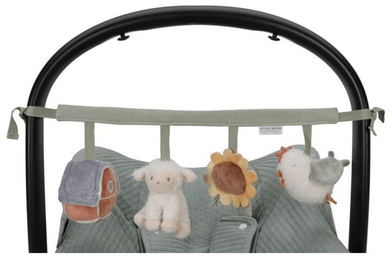 Este juguete de carrito de la nueva colección Little Farm de Little Dutch es fácil de enganchar a la sillita de coche o al carrito y proporciona horas de juego y diversión cuando estás en marcha con los juguetes que lleva, un sonajero, un espejo, un juguete crujiente. Además estimula la coordinación ojo-mano.